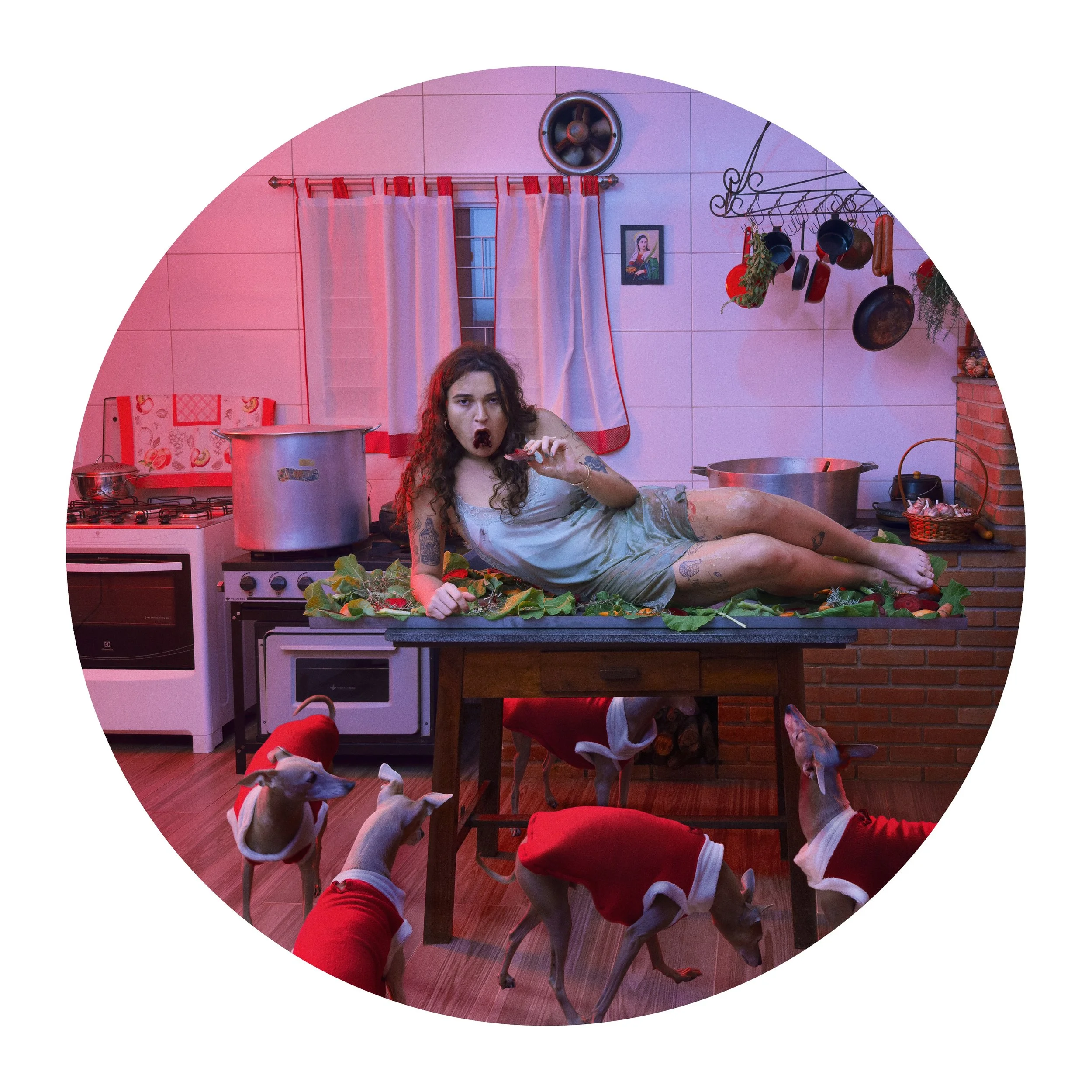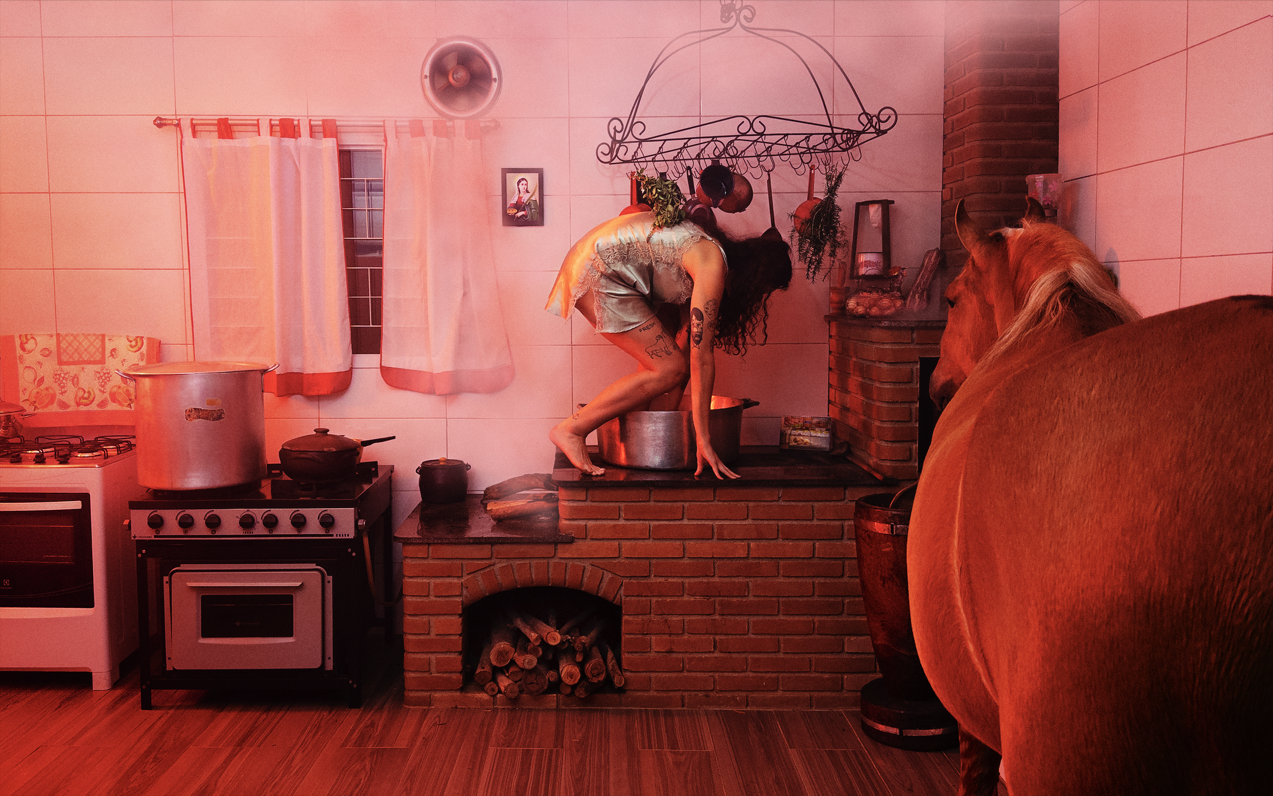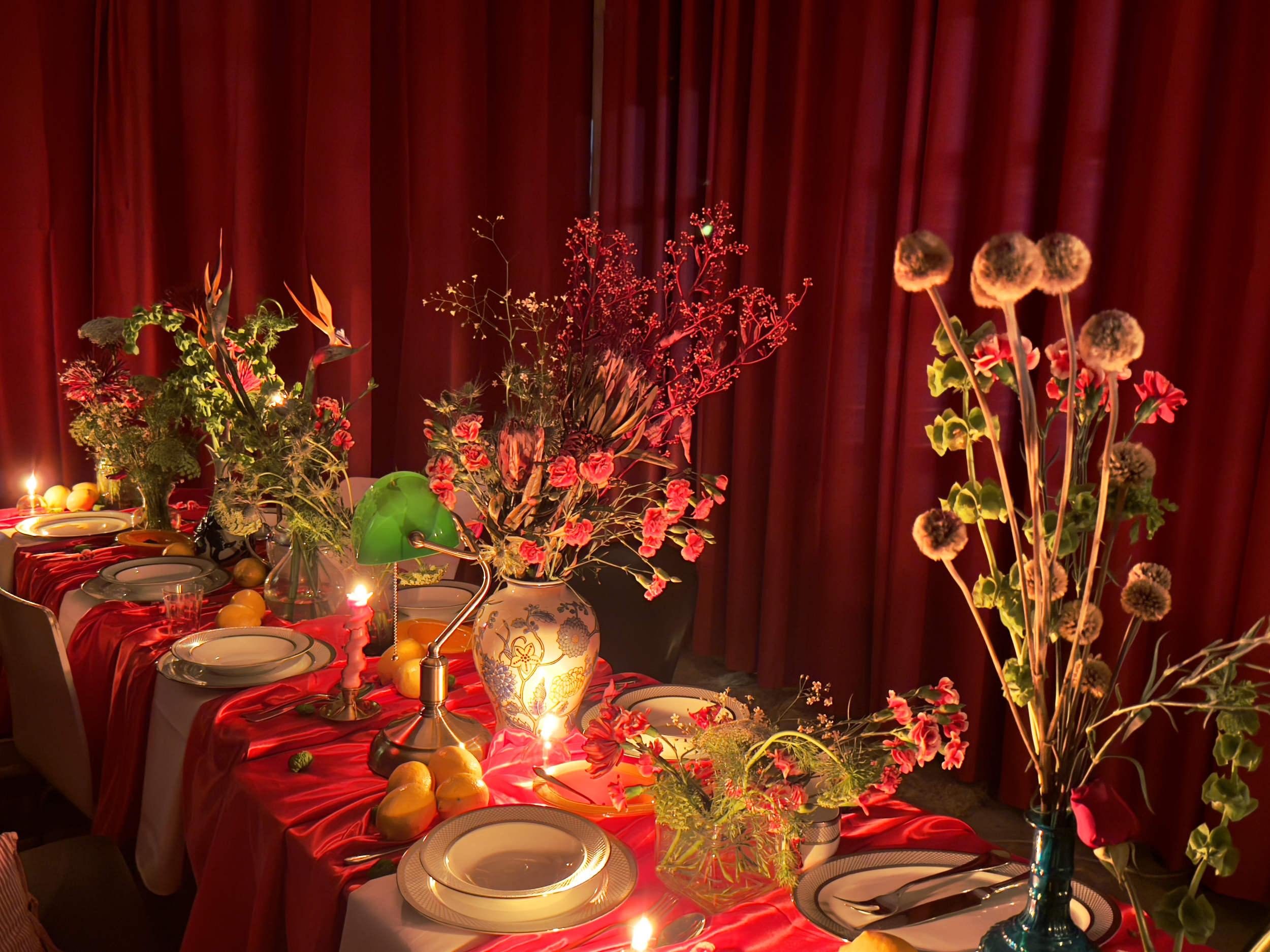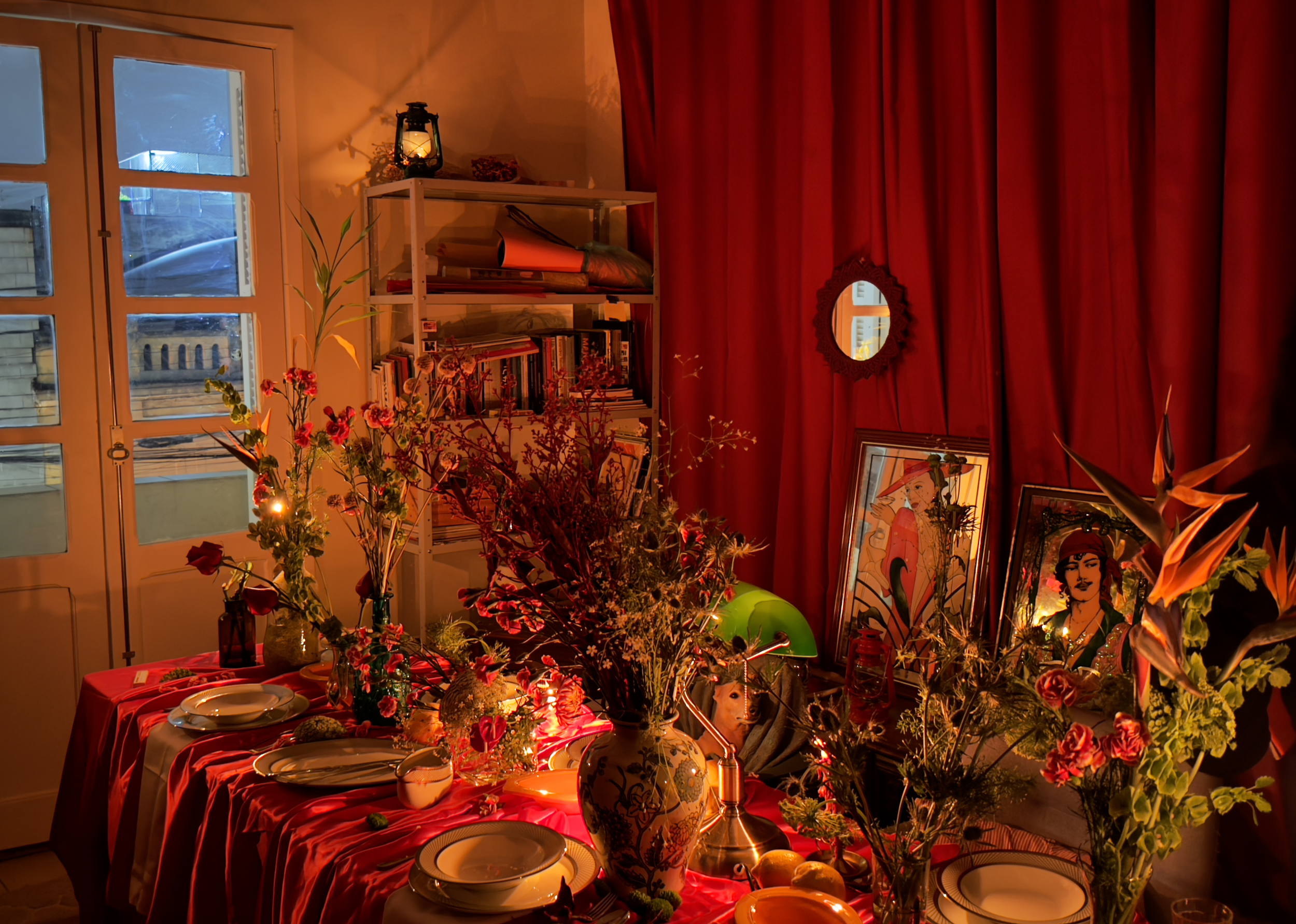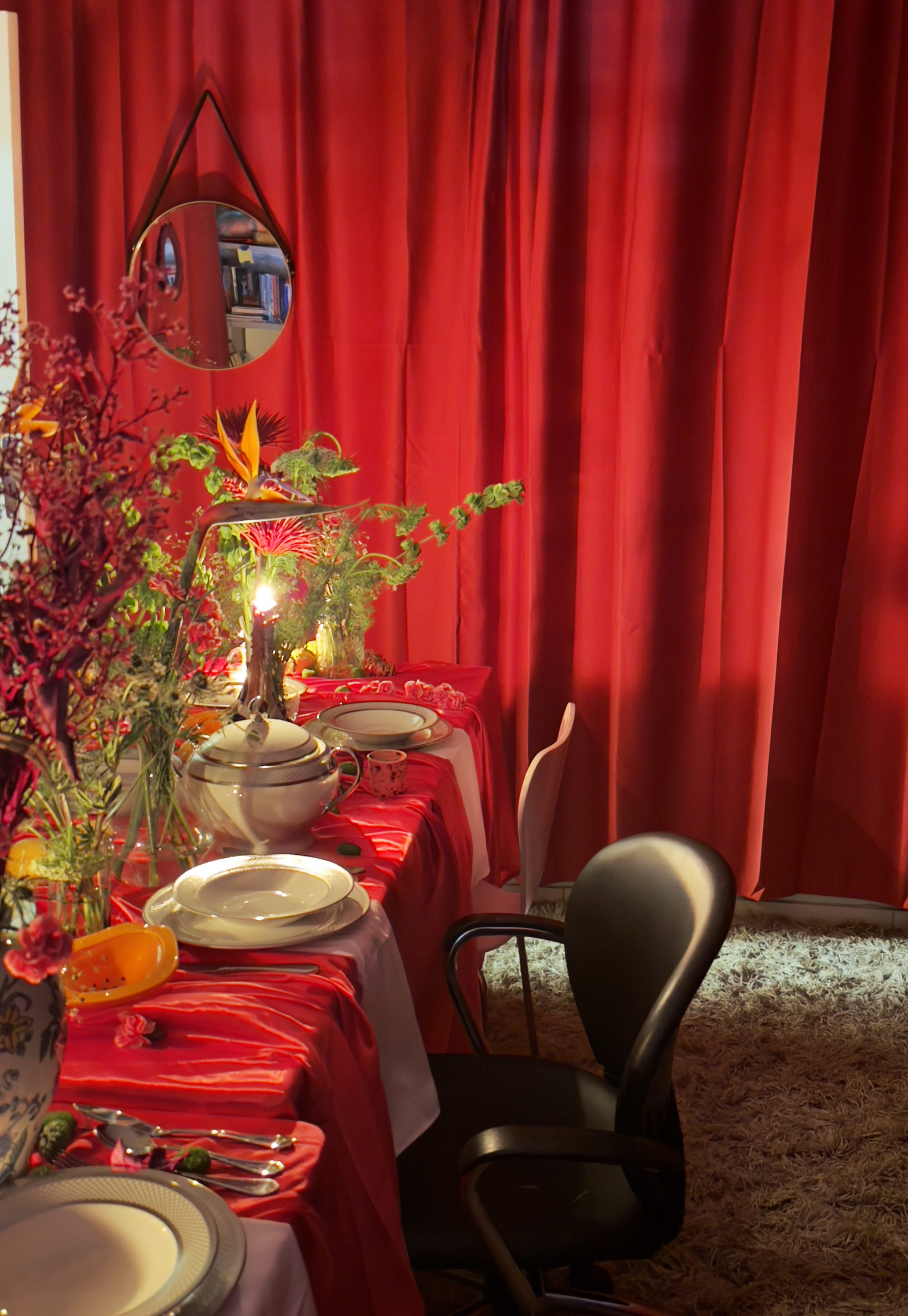Calor de interiores transforma a sala de jantar em uma câmara térmica. Duas mesas retangulares, cortinas vermelhas e louças compõem um cenário doméstico saturado por velas, luminárias, lamparinas, lareira ecológica, lareiras elétricas e aquecedores. O calor concentra o ar e acelera o tempo: as flores exibem ao vivo o percurso do frescor ao murchar, um relógio biológico visível. O público atravessa o ambiente fechado sentindo a temperatura subir, entre atração e incômodo. Inserida no Ato II de por dentro sou vermelha, por fora sou dourada, capítulo de vigília e transe, em que a encenação funciona como defesa, a instalação propõe um banquete que nunca se consuma: um forno interior onde vida e exaustão se roçam.