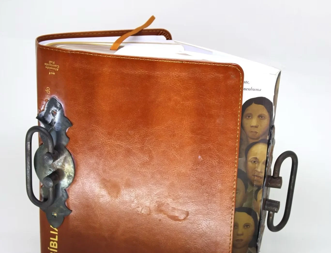 Exposto sobre um suporte de Bíblia, a obra dialoga com a ideia de fundação, imposição e disputa de narrativas na história do país. Entre união e ruptura, permanência e destruição, livro-arbítrio tensiona as relações entre identidade, memória e poder, questionando o quanto da nossa história pode realmente ser separado sem perda ou cicatriz.