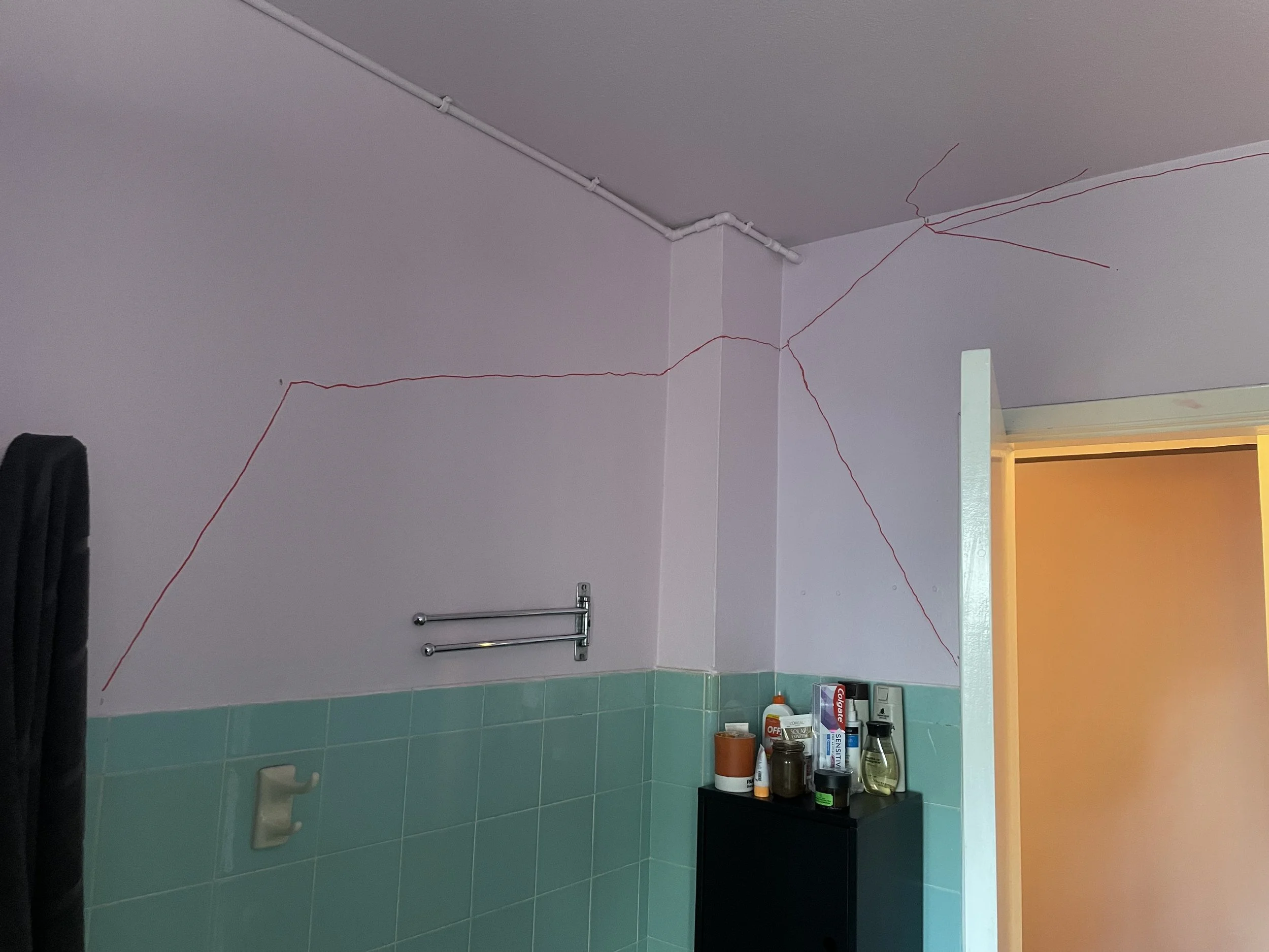 A obra não propõe reparo, mas exposição: ao marcar diretamente as superfícies da casa, a artista transforma um espaço íntimo em território de inscrição e leitura. As linhas vermelhas, feitas de uma só vez, funcionam como rachaduras visíveis que revelam os estados de desgaste e abandono do ambiente, tensionando os limites entre o que é estrutura e o que é falha, entre gesto artístico e ruína silenciosa.